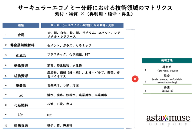 サーキュラーエコノミーの実現には、付加価値を生みながら社会全体で最大限の製品利用を図るビジネスモデルの拡大に加え、これまで廃棄・排出されていたものを活用するための技術を軸としたイノベーションが必要です。アスタミューゼでは、サーキュラーエコノミー分野における技術領域を、図4の(素材・物質)x(再利用・延命・再生)のマトリクスによって独自に定義しています。