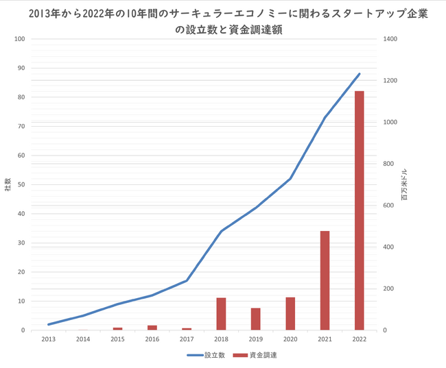 最も多額の資金を集めた企業は、2021年に設立された米国のCircular Services社(注1)で、2022年に200万米ドルを調達しました。この企業は紙、金属、ガラス、プラスチック、有機物、繊維製品、電子機器などを選別、処理、再利用する技術を提供し、米国内のサプライチェーンで継続的な再利用を実現しています。なお、日本からはサーキュラーエコノミーを明示したスタートアップ企業は確認されていません。