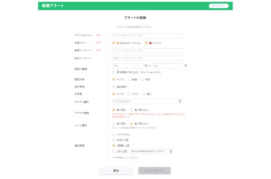 検索アラートは、あらかじめ設定した時刻、検索条件をもとに該当商品の出品状況を通知する機能です。