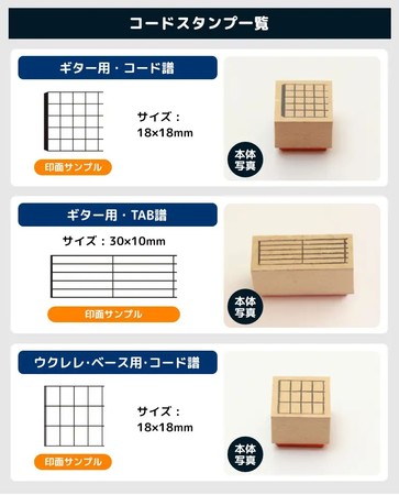 「音楽ずかん 楽器練習スタンプ」はミュージシャンの方からいただいた「楽譜にコード譜やTAB譜を書きこむのが面倒なのでどうにかなりませんか?」という声から企画したはんこ。昨年発売した第一弾では、ギター用コード譜、ギター用TAB譜、ウクレレ・ベース用コード譜、ピアノ用運指図、バイオリン用運指図、サックス用運指図の7種類が登場しました。