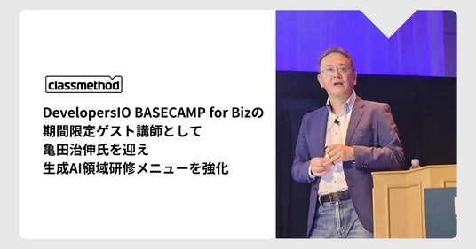 クラスメソッド株式会社(本社:東京都千代田区、代表取締役:横田聡、以下 クラスメソッド)は、ビジネス推進を後押しする法人向けトレーニングを提供する「DevelopersIO BASECAMP for Biz」の期間限定のゲスト講師として、AWS、Cloudflareのエバンジェリストを歴任し、日本全国に新しいクラウドテクノロジーを広げるためのハンズオン等を行っている亀田治伸氏を迎え、生成AI領域における研修メニューを強化します。また、研修メニューの強化にあたり、ビジネスパーソン向け生成AIトレーニング、コンサルティングを開始します。