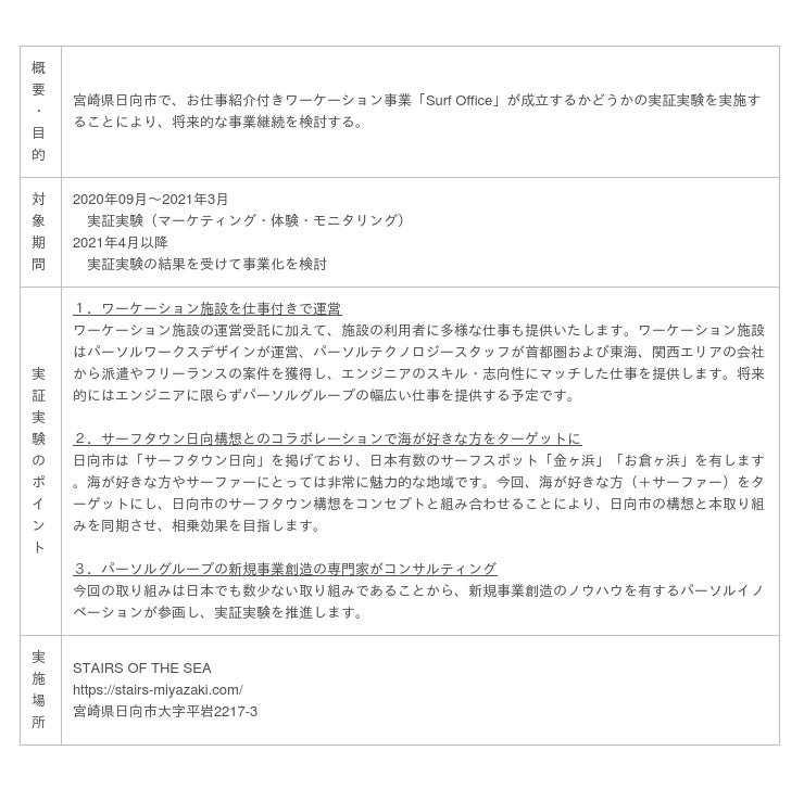 総合人材サービスのパーソルグループで、BPO、ヘルプデスク/コールセンターのアウトソーシングなどを手掛けるパーソルワークスデザイン株式会社(代表取締役社長:平林 由義、本社:東京都豊島区/以下、パーソルワークスデザイン)と、 IT・ものづくりエンジニアの人材派遣を手掛けるパーソルテクノロジースタッフ株式会社(代表取締役社長:正木 慎二、本社:東京都新宿区/以下、パーソルテクノロジースタッフ)、および新規事業創出・オープンイノベーション推進を手掛けるパーソルイノベーション株式会社(代表取締役社長:高橋 広敏、本社:東京都港区/以下、パーソルイノベーション)は協業し、宮崎県日向市が主催する「ワーケーションオフィス調査事業」に参画し、2020年9月より実証実験を開始します。