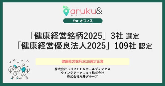 今回、「aruku& for オフィス」を導入する3社が「健康経営銘柄2025」に選定されました。株式会社SCREENホールディングスとウイングアーク1st株式会社は2回目、株式会社丸井グループは昨年に引き続き8回目の選定となります。また、109社が「健康経営優良法人2025」に認定されました。健康経営優良法人は、大規模法人部門に83社(うちホワイト500に21社)、中小規模法人部門に26社(うちブライト500に2社、ネクストブライト1000に3社)が認定され、昨年(85社)と比較すると24社増という結果になりました。(※企業名は、「健康経営銘柄2025」選定企業リスト順)