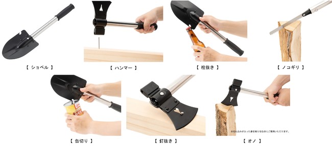 ショベル、ハンマー、栓抜き、ノコギリ、缶切り、釘抜き、オノの7WAYで使用できる多機能ショベル。