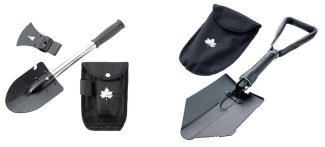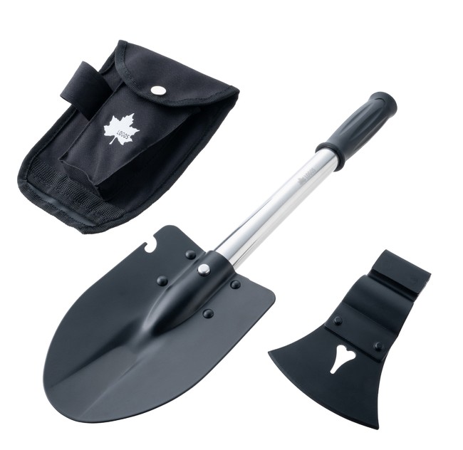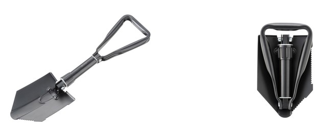 3つ折りできるコンパクト収納なショベル。大きめなので、車がスタックしてしまった時の脱出用としても大活躍。刃の片側はノコギリの刃になっているので、非常用のノコギリとしても使用できる。