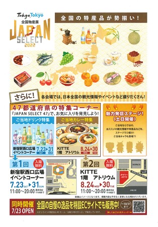 Tokyo 全国物産展JAPAN SELECT 2022(8/24~8/30)がKITTEにて開催されます。都内にあるアンテナショップなどと連携し、特産品の展示や各地の観光PRを通じて日本各地の魅力を紹介する東京都主催のイベントです。