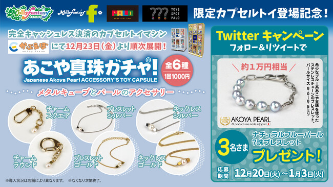 株式会社イオンファンタジー(本社:千葉県千葉市、代表取締役社長:藤原徳也、以下、当社)は、13年連続真珠生産日本一の宇和島で真珠の卸売業を営む宇和海真珠株式会社(本社:愛媛県宇和島市、代表取締役社長:松本和彦)の『あこや真珠』アクセサリーをアミューズメント施設「モーリーファンタジー」「PALO」、カプセルトイ専門店「TOYS SPOT PALO」などに設置する当社オリジナル完全キャッシュレスカプセルトイマシン「かぷえぼ」限定のカプセルトイとして12月23日(金)より順次展開いたします。
