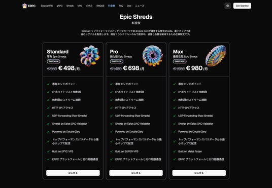すべてのプランにおいて、専有エンドポイント、IP ホワイトリスト無制限、無制限のストリーム接続、HTTP (IP) アクセス、UDP Forwarding(Raw Shreds)、Shreds by Epics DAO Validator、Powered by DoubleZero、トップパフォーマンスバリデータからの最小ホップ配信、ERPC プラットフォームとのゼロ距離通信を標準で備えています。