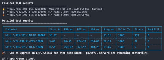 フランクフルトリージョン限定、全プラン合計 960 接続の数量限定提供です。同一環境での計測において、従来の Shredstream に対し勝率 95.82% を記録。P50 で約 86ms、P95 で約 204ms、P99 で約 234ms の速度優位を確認しています。