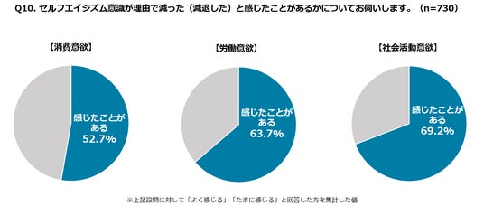 あなたはセルフエイジズムを感じたことがありますかという問いに対し、「大いに感じたことがある」「たまに感じたことがある」と回答した方にその影響を確認したところ、さまざまな意欲低下をもたらしていることがわかりました。具体的には、欲しいものを購入したり、体験したいサービスを利用するといった「消費意欲」、働きがいをもって仕事をしたり、自身の希望の仕事に挑戦する「労働意欲」、人とコミュニケーションをとったり、交流の場に出向くといった「社会活動意欲」が低下することが明らかになったことから、セルフエイジズムはひとつの社会課題といえます。