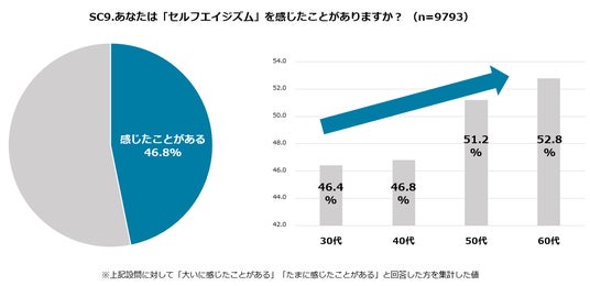 セルフエイジズム実感度は全体で46.8%、年齢と比例して高くなる結果に。