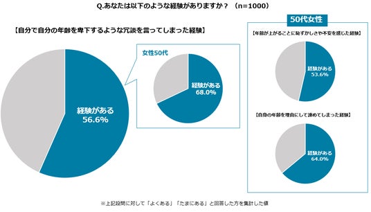 セルフエイジズムを意識する具体的なエピソードの問いに対し、「自分で自分の年齢を卑下するような冗談を言ってしまった経験」はもっとも高く全体で56.6%の方が経験があると回答しました。中でも、その他2点のエピソード「年齢が上がることに恥ずかしさや不安を感じた経験」、「自分の年齢を理由にして諦めてしまった経験」についてはどれも50代女性が全年代・性別においても高いことがわかりました。