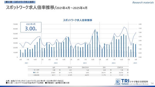 2025年4月度のスポットワーク求人倍率は3.00倍となり、前月差で0.51ポイント上昇しました。前年同月差では1.44ポイントの上昇となり、これで11か月連続の上昇となります。また、この1.44ポイントの上昇幅は、前年同月差として過去最大となりました。