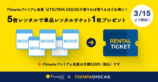 応募条件:専用フォームにて参加登録後(月内であればレンタル後のフォーム登録でも可)、Filmarksプレミアム会員(月額550円/税込)かつTSUTAYA DISCAS会員の方でDVD/ブルーレイを都度課金プランで5枚レンタルしていただくと自動的にキャンペーン参加完了。単品レンタルチケット1枚を翌月末までにマイページにて付与。