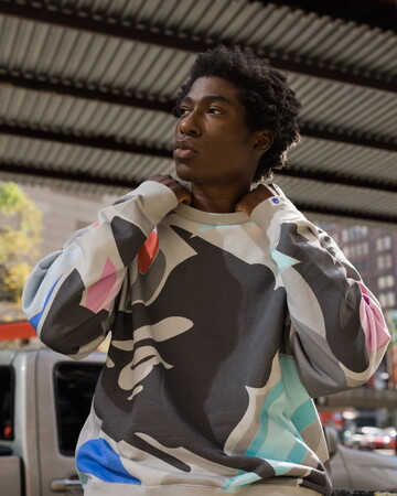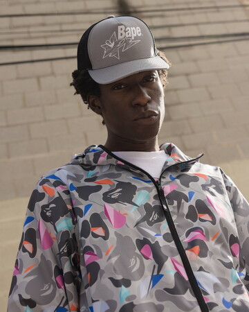 BAPE(R)︎のシグネチャーであるBAPE(R)︎ CAMO、APE HEAD、BAPE STA LOGO、BABY MILO(R)︎などに彼の代名詞であるカラーリング、幾何学的な抽象画のスタイルをアクセントとして加えています。