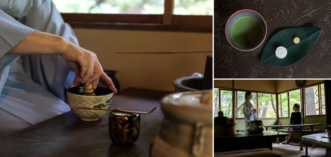 「呈茶」のプランでは、椅子にお座りいただく形式の「立礼席(りゅうれいせき)」にて、茶室の裏手にある水屋で点てた抹茶とお菓子をご提供します。ご予約は不要で、どなたでもお気軽にお立ち寄りいただけます。