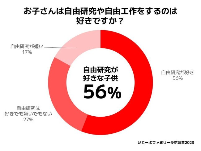 自由研究が好きか嫌いかに関する項目では、「自由研究が好き」は56%。「好きでも嫌いでもない」が27%。多くの子供が自由研究を「好き」な様子がうかがえます。