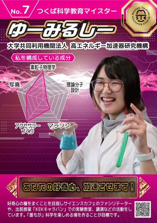 今後、科学教育マイスターとして活動していくことについて、「年齢や障害の有無に関わらず、誰もが科学に好奇心を持てる場づくりをしていきたい。研究学園都市のいろいろなステークホルダーとの繋がりを活かし、科学の楽しさと市民をつなぐのりしろの役割を担っていきたい」と抱負を語るゆーみるしーマイスター。
