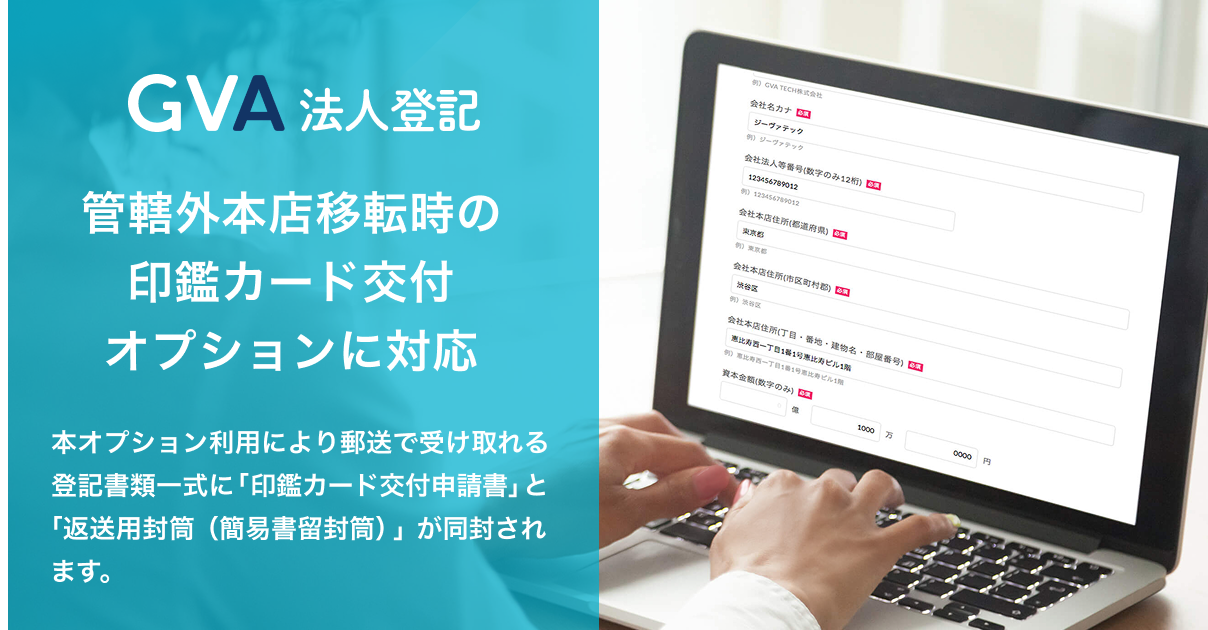 リーガルテックサービスの開発・運営を行うGVA TECH株式会社(本社:東京都渋谷区、代表取締役:山本 俊)が運営する法人登記クラウド「GVA 法人登記」にて、管轄外本店移転時の印鑑カード交付申請を支援する「印鑑カード交付オプション」の提供を開始したことをお知らせいたします。