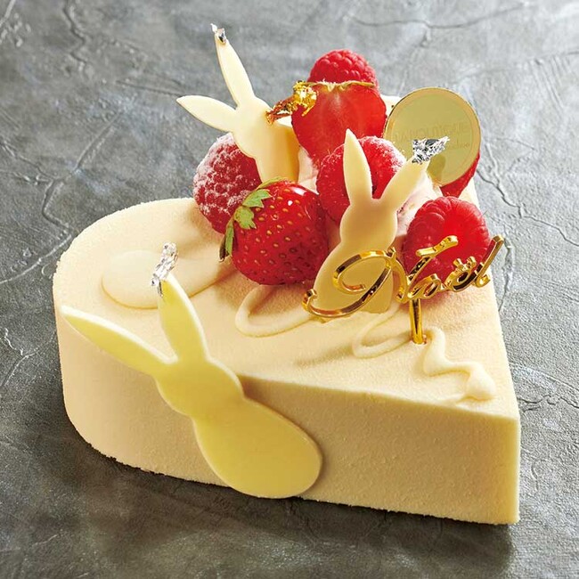 ハートの雪原に舞う、愛らしいうさぎが印象的。ミルキーな甘さのホワイトチョコレートムースに、甘酸っぱいジュレを閉じ込めた毎年人気のケーキです。
