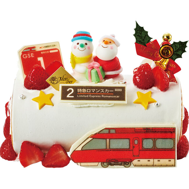 それぞれこだわりの味わいと写真映え抜群の可愛らしいデザインから、お子さまから大人まで楽しめるケーキとしてトップの人気を誇るロマンスカーモチーフのケーキ。『パティスリ― ユウ ササゲ』からはピースするサンタさんが可愛らしいチーズケーキ、『パティスリー モンシェール』からはチョコレートの飾りを自分でデコレーションして仕上げを楽しめるケーキが登場します。