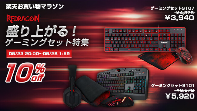 楽天市場「Show !t」は5月23日20:00~5月28日01:59まで開催される、楽天お買い物マラソンに参加し、PCゲーム向けのREDRAGONウスやマウスパッド、ヘッドセット、キーボードなど、スターターセットをセール価格で販売します。ポイント10倍プレゼントのこの機会に、ゲーム用品を揃えて秋の夜長をゲームをして楽しみましょう。