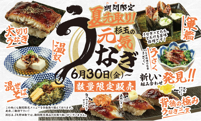 株式会社FOOD & LIFE INNOVATIONS(本社:東京都千代田区、代表取締役社長:山邉 圭介)は「鮨 酒 肴 杉玉」にて6月30日(金)より、“蒸し”と“焼き”工程を繰り返し、旨みを凝縮させたうなぎを使用した商品が期間限定で登場いたします。