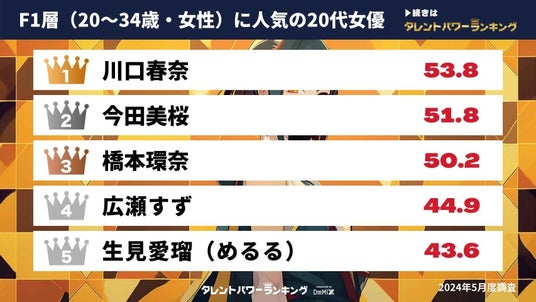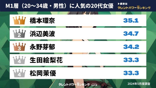 『タレントパワーランキング』では、タレントパワーランキングに登録されている20代女優について、M1層(20~34歳男性)とF1層(20~34歳女性)が回答した、それぞれの結果を調査。