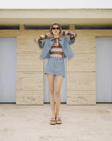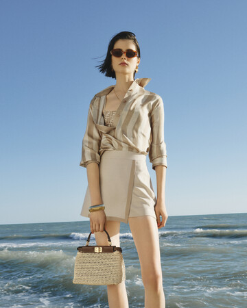 アクセサリーおよびメンズウェアを担当するアーティスティック ディレクター、シルヴィア・フェンディ(Silvia Venturini Fendi)によるアクセサリーが、コレクション全体の物語を包み込むとともに、さまざまな着用者に向けた魅力を放ちます。だれもが自分らしくあることを後押しし、ローマの自由を謳歌しようとするフェンディウーマンは、ひとりではありません。バッグおよびシューズにおいても「ペカン」ジャカードや「FF」ロゴデニム、ラフィア、ウーブンレザー、エンブロイダリーに加え、カジュアルとハンドクラフトが組み合わされたエキゾティックな夏のムードが取り入れられ、卓越したサヴォアフェールが表現されています。