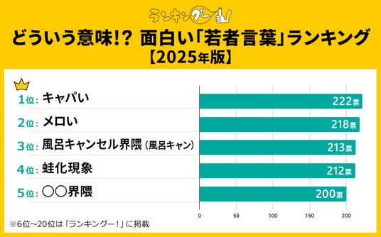 1位~5位まで僅差で順位が決定しました。1位はモデル・ゆうちゃみさんが発案し、「キャパオーバー」を略した言葉の「キャパい」。2位は「メロメロになるほどかっこいい、かわいい」という意味の「メロい」。3位はお風呂に入るのをやめる(お風呂をキャンセルする)ことを意味する「風呂キャンセル界隈(風呂キャン)」。4位は好意を抱いている相手のささいな言動が気になり、気持ちが冷めてしまうことを意味する「蛙化現象」。そして、5位は、特定の趣味や関心を共有する人たちを指す若者言葉の「◯◯界隈」がランクインしました!