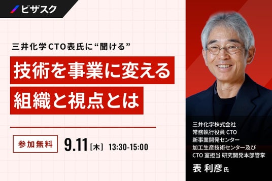 「知見と、挑戦をつなぐ」をミッションにグローバルなナレッジプラットフォームを運営する株式会社ビザスク(以下、当社)は、『技術を事業に変える組織と視点とは』をテーマに、三井化学株式会社 常務執行役員 CTO 新事業開発センター、加工生産技術センター及び CTO 室担当 研究開発本部管掌 表 利彦 氏 ご登壇による無料オンラインセミナーを 9/11 (木) 13:30 より開催します。