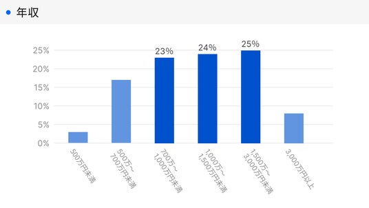 2025年における成約顧客の年収は、700万円~1,000万円未満が23%、1,000万円~1,500万円未満が24%、1,500万円~3,000万円未満が25%でした。 グラフからも特定の年収帯に限定されず、幅広い層のお客様がそれぞれのライフスタイルにあわせて不動産投資を選択している傾向が見てとれます。