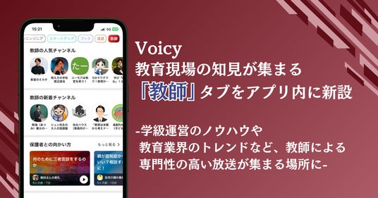 株式会社Voicyが運営する音声プラットフォームVoicyは、教育現場からの情報発信ニーズの高まりと、専門的な情報を求めるリスナーの声に応え、6月11日(水)より「教師」タブをアプリ内に新設いたしました。この「教師」タブは、学級運営のノウハウや教育業界のトレンドなど、教師による専門性の高い放送が集まる場所となります。