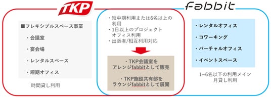 TKPは、貸会議室やイベントホールを運営しており、約30,000社におよぶ年間利用顧客のニーズに応えるサービスを提供してまいりました。このたび、国内外20拠点(国内18拠点、海外2拠点)にわたってレンタルオフィス、コワーキングスペース、バーチャルオフィスを展開する「fabbit」事業を譲り受けることで、一時的なオフィス需要への対応などをはじめ、大企業から中小企業、スタートアップ企業まで幅広い企業の経済活動をさまざまな形でサポートする体制を強化します。