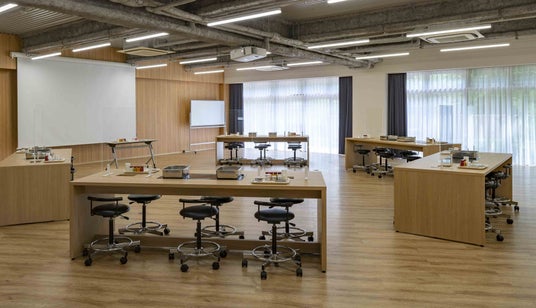 兵庫研修センター:大型講義ホール・研修ルーム・実技教室以外に、「展示&体験ギャラリー」や体験スペースの「ナリスラボ」、「発信スタジオ」などの設備を整備しています。「ダイニング&カフェ」や「キッズスペース」を完備しているため託児も可能です。