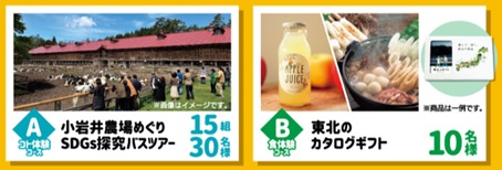 「東北フェア」対象商品1品以上を含む、700円(税込)以上ご購入のレシートに発行されるIDでご応募いただくと、「小岩井農場めぐりSDGs探究バスツアー」や「東北のカタログギフト」が抽選で当たる「東北の魅力満喫プレゼントキャンペーン」を実施いたします。