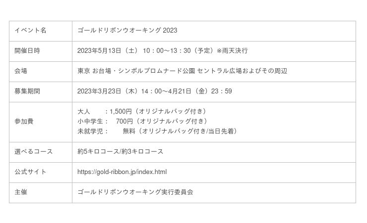 ゴールドリボンウオーキングは2007 年東京からスタートした小児がんの子どもたちとそのご家族を応援するチャリティイベントです。小児がん支援のシンボルマークである“ゴールドリボン”の存在を知っていただき、小児がんという病気を理解していただくキッカケになるべく、たくさんの参加者とゴールドリボンのグッズを身に着けたウォーキングでその存在を伝えています。これまでに、東京・大阪・福岡・京都で開催し、のべ54,000 人以上が参加・支援しています。