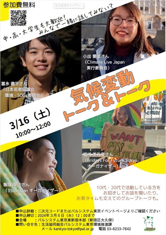 生活協同組合パルシステム東京(本部:東京都新宿区大久保、理事長:松野玲子)は3月16日(土)10時から12時10分まで、東新宿本部で気候変動問題に向き合う若者たちとともにトークイベントを開催します。地球温暖化の危機的状況に警鐘を鳴らす4団体で活躍する、高校生はじめ次世代が行動を呼びかけます。