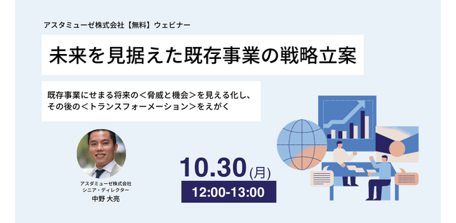 アスタミューゼ株式会社(本社:東京都千代田区、代表取締役社長 永井歩)は、2023年10月30日(月)12:00-13:00に、無料ウェビナー「未来を見据えた既存事業の戦略立案 ~既存事業にせまる将来の<脅威と機会>を見える化し、その後の<トランスフォーメーション>をえがく~」を開催いたします。10月16日に開催した同タイトルのウェビナーの再開催となります。