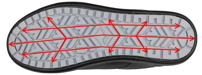アウトソール意匠には、つま先から踵方向と斜め方向にかけて、水や油が流れ出やすくするための溝を配置(下記赤矢印参照)しています。水や油が溜まることで起きるスリップに対し、溝を配置することで水や油のはけをよくし、滑りにくくしています。
