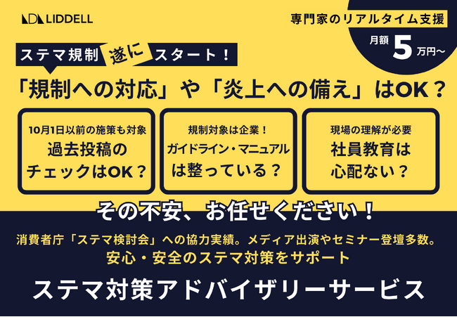 SNS・インフルエンサーマーケティング事業を展開するLIDDELL株式会社(本社:東京都港区、代表取締役:福田 晃一、以下リデル)は、2023年10月1日より施行された、景品表示法「ステマ規制」への対策をサポートする《ステマ対策アドバイザリー》サービスを展開いたします。