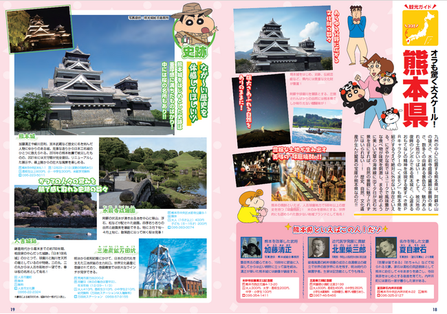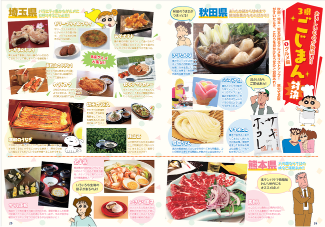 気になるその内容は、「家族都市」3県を代表する観光地や名所、グルメ、家族や友達と楽しめるアクティビティ等をしんちゃんたちが紹介しているのはもちろん、『新クレヨンしんちゃん』13巻に掲載された、秋田・埼玉・熊本が登場する「家族都市」ストーリーの漫画もまるごと掲載! さらに、しんちゃんのコミックスやアニメ・映画の中で、3県に実在する場所が登場したシーンの紹介もあり、しんちゃんと3県とのつながりをしっかりと感じられる内容になっています。