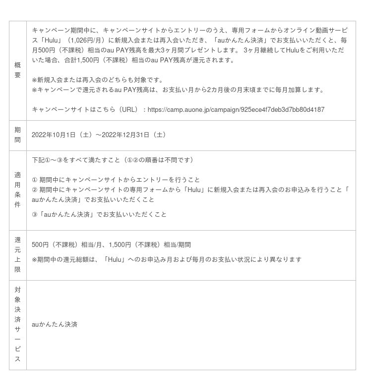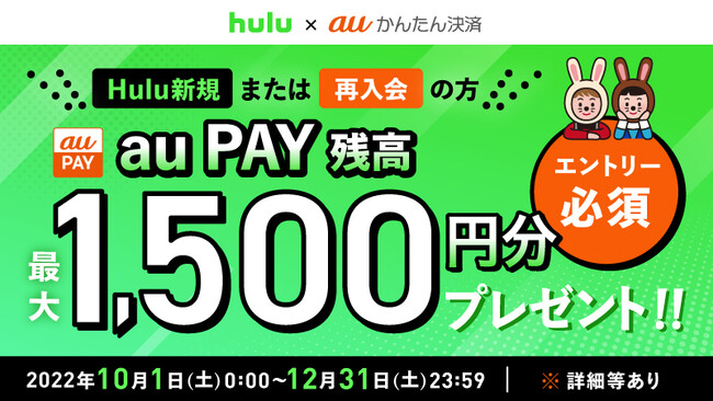 HJホールディングス株式会社は2022年10月1日(土)から2022年12月31日(土)まで、「auかんたん決済」でHuluにご入会頂いた方を対象に、毎月500円(不課税)相当のau PAY残高を最大3ヶ月還元する「Hulu × auかんたん決済キャンペーン」を開催します。期間中に申込みいただき、3ヶ月継続してHuluをご利用いただいた場合、合計1,500円(不課税)相当のau PAY残高が還元されます。