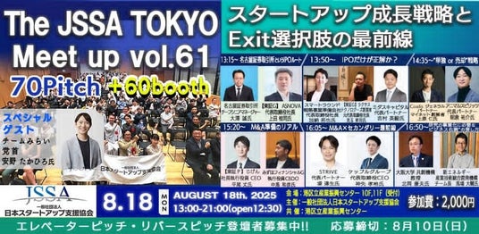 新規事業のプラットフォームサービス構築を手がける株式会社カスタメディア(本店:大阪府大阪市、代表取締役:宮崎 耕史、以下 当社)は、8月18日(月)に開催される、起業家と支援者に気づきと学び、そして運命的な出会いを提供するコミュニティの場「THE JSSA TOKYO MeetupVol.61」(主催:一般社団法人日本スタートアップ支援協会 共催:港区立産業振興センター)にブース出展およびエレベーターピッチ登壇いたします!