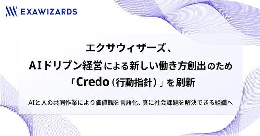 株式会社エクサウィザーズ(東京都港区、代表取締役社長CEO:春田 真、以下エクサウィザーズ)は、AIドリブン経営で新しい働き方を創出するため「Credo(行動指針)」の刷新を行いました。AIをとりまく事業環境は、大きな転換点を迎えようとしています。そうした中、「AIを用いた社会課題解決を通じて、幸せな社会を実現する」というミッションの実現を目指し、組織自体を進化させ、人間の創造性とAIの能力を最適に組み合わせた新しい働き方を構築する必要があると考えました。新しいCredoのもと、真に社会課題を解決できる組織へと成長してまいります。