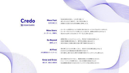 Credoの刷新にあたり、春田社長は「真にAI時代をリードするためには、組織自体も強く進化し結果を出していかなければなりません。そうした時に、みんなが夢中になって仕事に取り組むことで結果を出せる組織にしていきたいと考えました。それを実現していくために、できるだけ覚えやすくシンプルにまとめたものが今回のCredoです。社員一人ひとりがエクサウィザーズらしさとして新しいCredoを語れるように浸透させていきたい」と述べています。