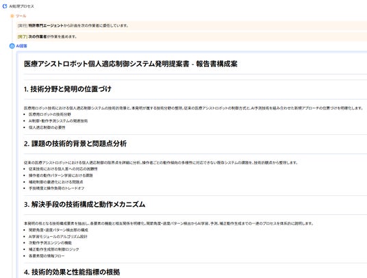 MyTokkyo.Aiは、研究メモや構想資料といった非定型な情報を入力するだけで、AIが内容を解析し、「課題」「解決手段」「技術的効果」という特許出願に必要な構成要素へ自動的に整理できる点が評価された。また、特許全文データベースを参照しながら調査を行うため、医療ロボット分野における個人適応制御技術の先行事例との違いを短時間で把握できる点も導入の決め手となった。