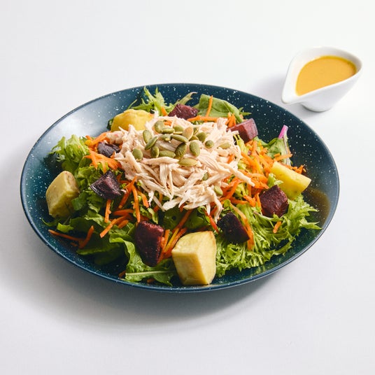 齊藤完一さんの無農薬野菜をたっぷり使用したサラダ。鶏むね肉でヘルシーながら食べ応え抜群。