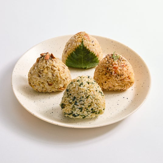 上:うめ鯖おにぎり 左:スパイスナッツおにぎり 右:トマトカマンベールのおにぎり 下:あおさのおにぎり
