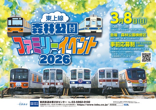 なお入場の申し込みやツアーの内容、有料イベントの申し込み方法等の詳細については 、 1月29日(木)12:00を目途に「東上線 森林公園ファミリーイベント2026 特設サイ ト」でお知らせします。 ※特設サイトURL: https://tobu-event.jp/familyevent/